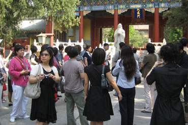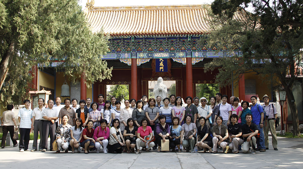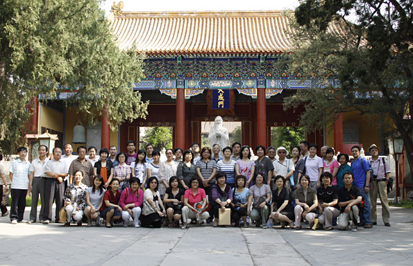 国子监比邻而建,为元、明、清三代祭孔的地方,与国子监共同构成了完整的古建筑群,是我国著名的风雅文化教育之地。置身于中国古代最高学府,仰望着万世师表孔圣人的雕像,站在林立的石碑前,中国古建精美的一屋一檐,一砖一瓦,绚丽斑斓的琉璃牌坊,让盟员们真真切切地感受到了文明古国的浓郁气息,一种与电视、书本上感受完全不同的古朴文化气息。