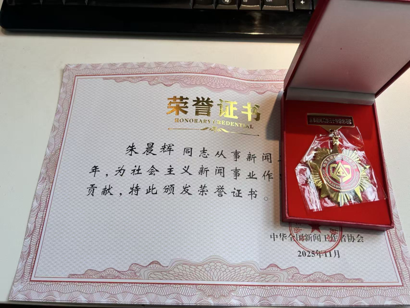 朱晨辉荣获“从事新闻工作三十年”证书证章