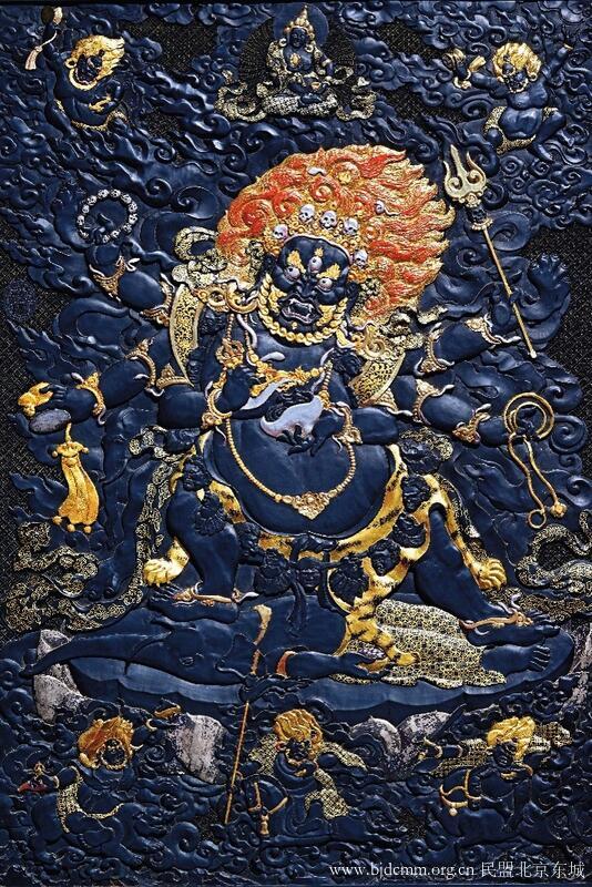 剔黑雕漆六臂玛哈嘎拉像,它最大的难度是在于它使用的是黑漆进行人物雕刻,在中国雕漆的历史上很少有以黑色漆作为载体的人像雕刻。
